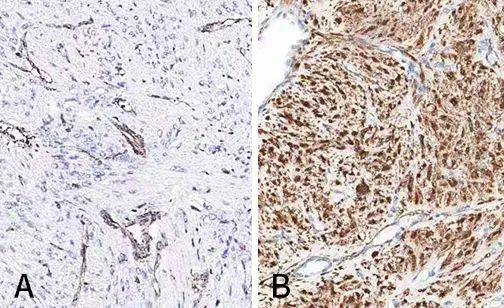 A. 免疫組化FH(-),血管陽(yáng)性為內(nèi)對(duì)照,中倍放大。B. 免疫組化2SC腫瘤細(xì)胞核和漿彌漫(+++),中倍放大。