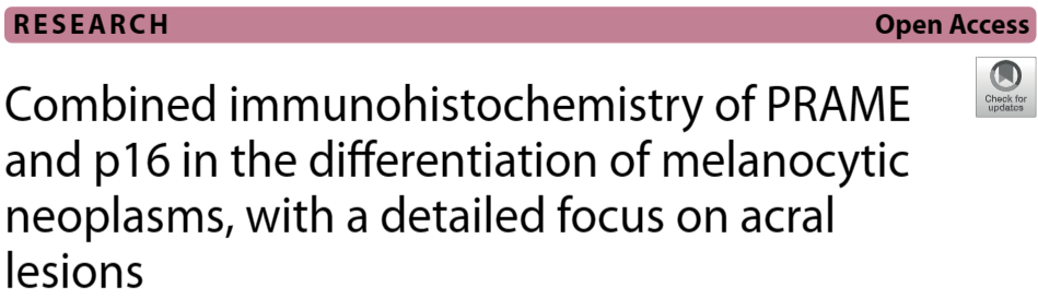【文獻題目】Combined immunohistochemistry of PRAME and p16 in the differentiation of melanocytic neoplasms, with a detailed focus on acral lesions.