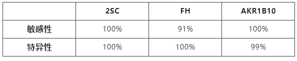 2SC抗體在兩個樣本系列中均表現出100%的敏感性和特異性優于AKR1B10和FH。