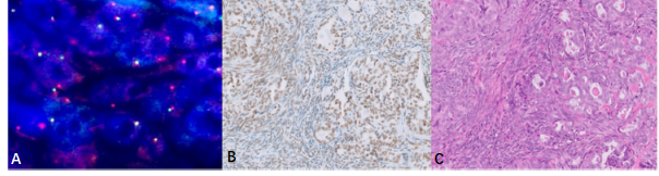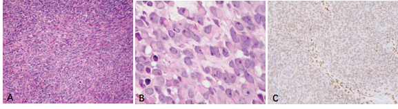圖2.雙相型滑膜肉瘤(A.HE染色,中倍放大)。免疫組化染色SS18-SSX(E9X9V)腫瘤細胞核彌漫強陽性(B.低倍放大,C.高倍放大)